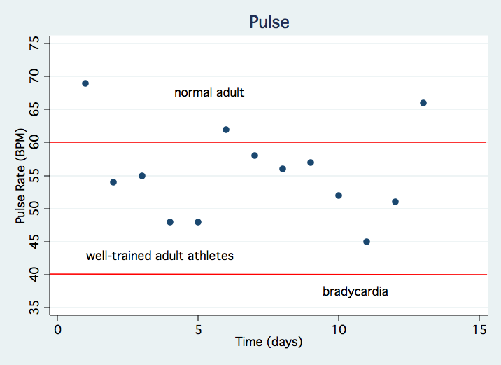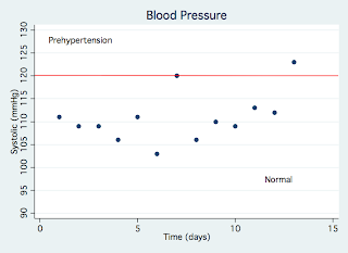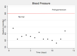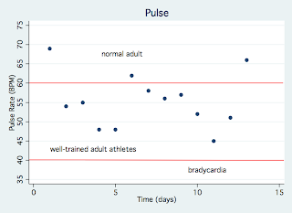 One of the primary criticisms of the Paleo Diet is that high-fat diets lead to the development of cardiovascular disease, so it seemed especially prudent to track measures of cardiac health. Here are my most recent data over the last 2 weeks on systolic blood pressure, diastolic blood pressure, and resting pulse rate: